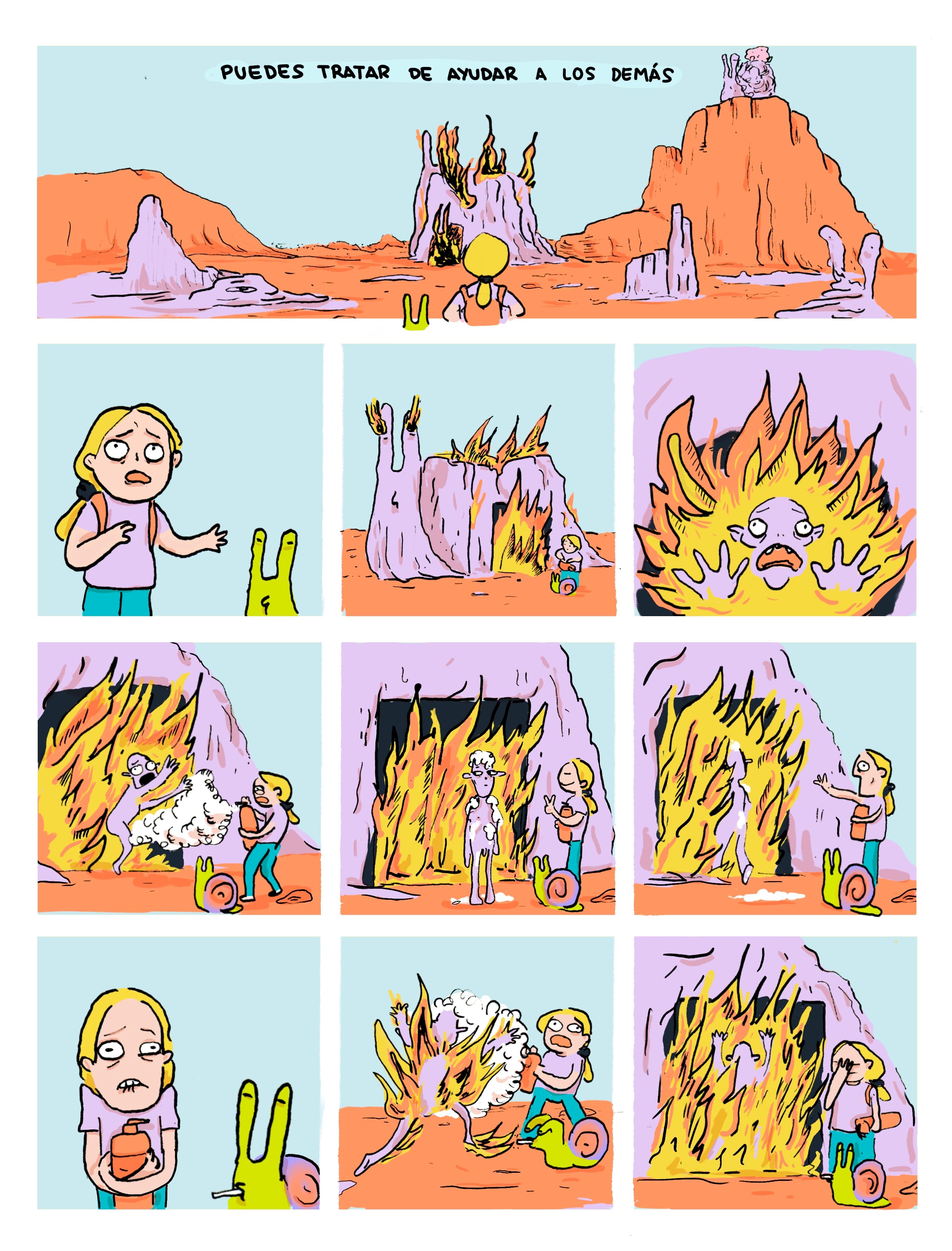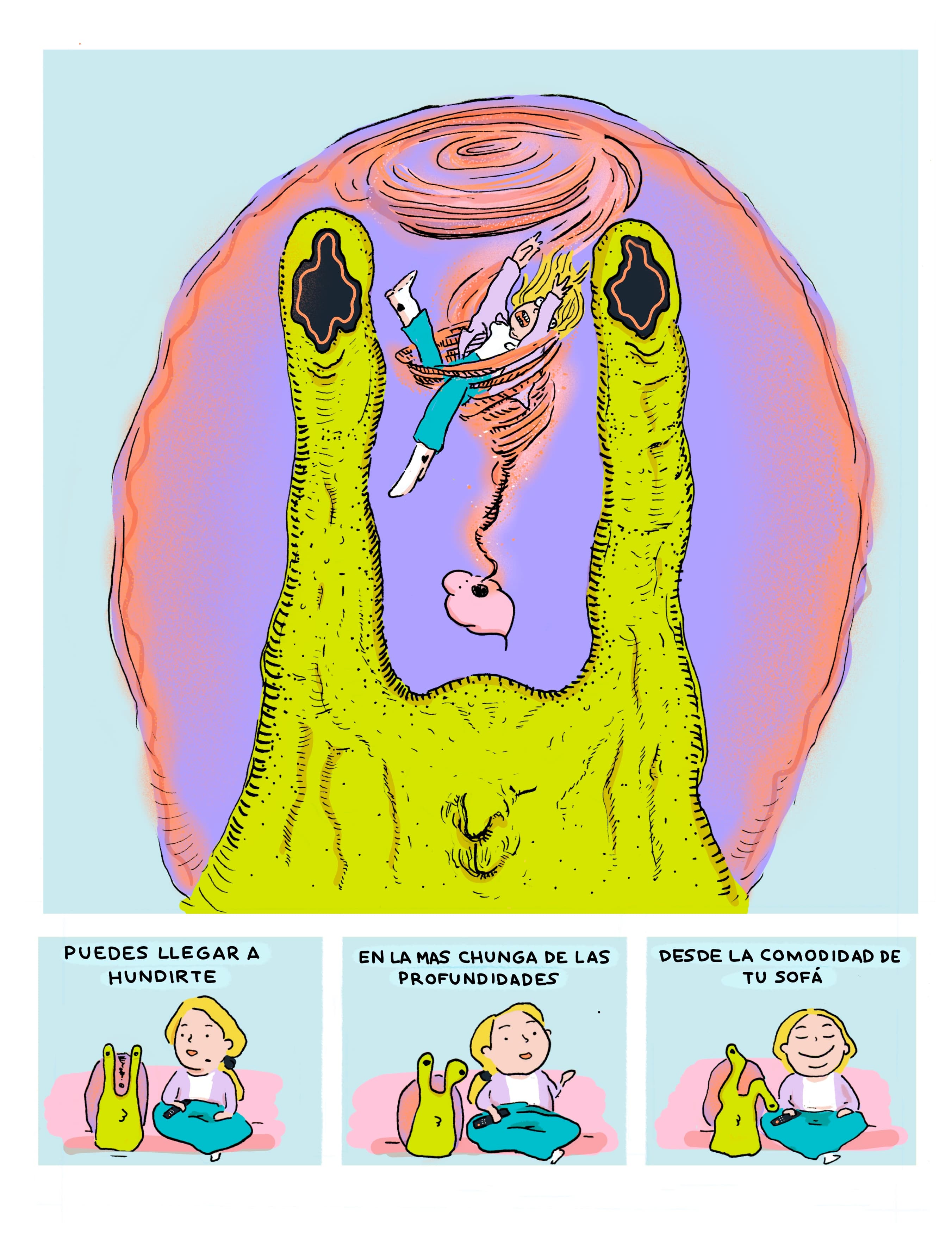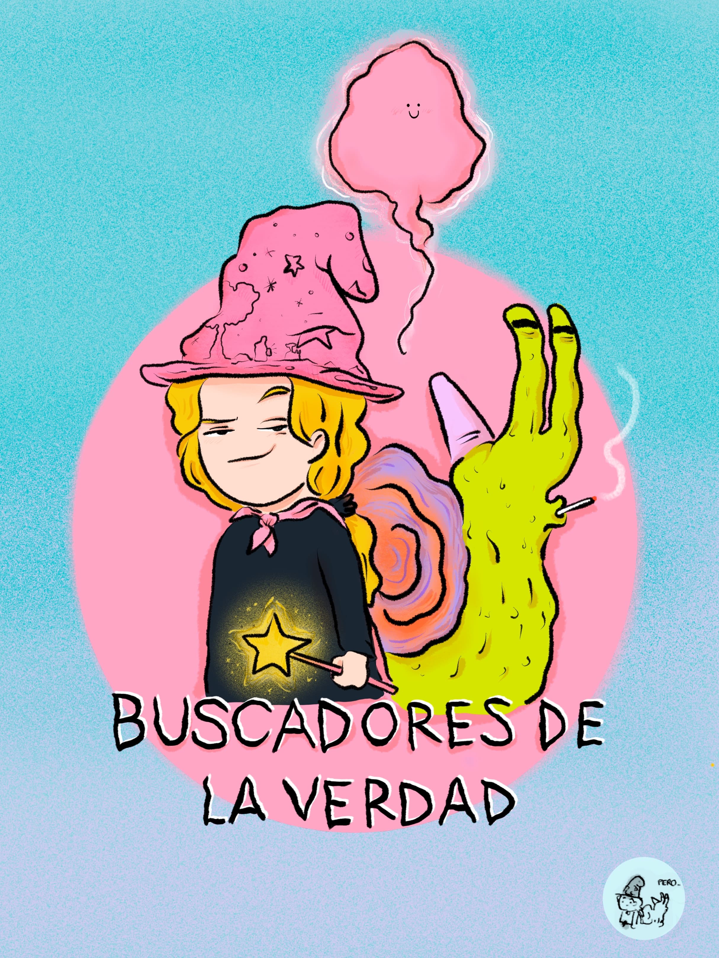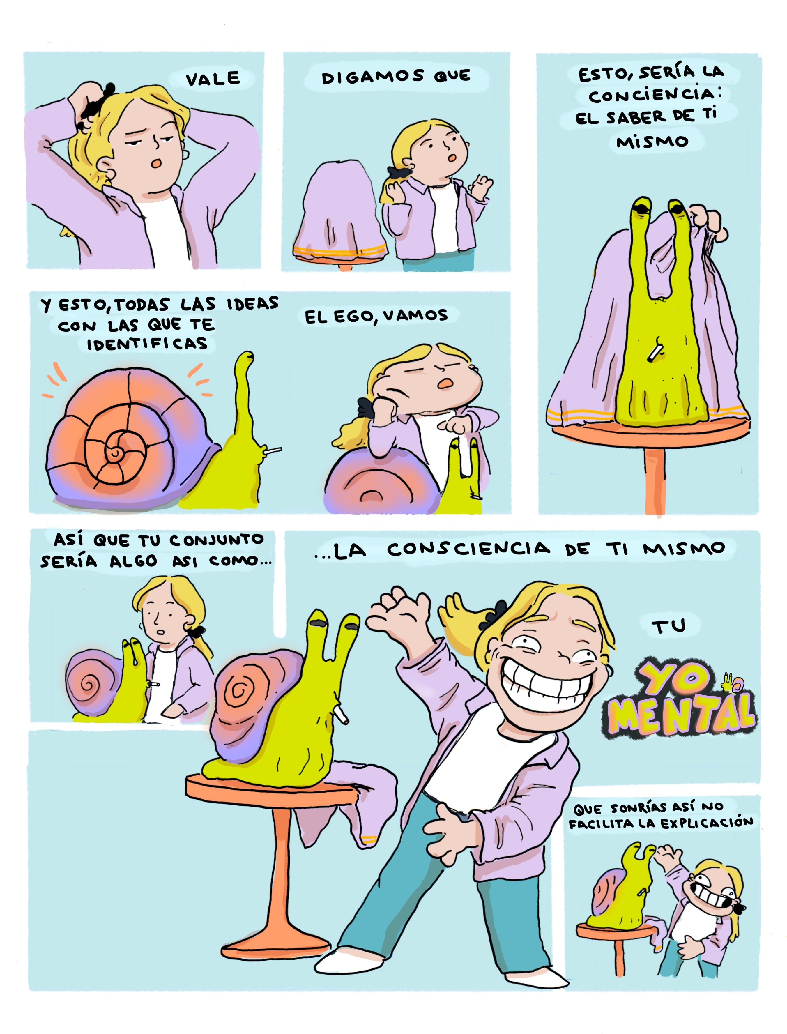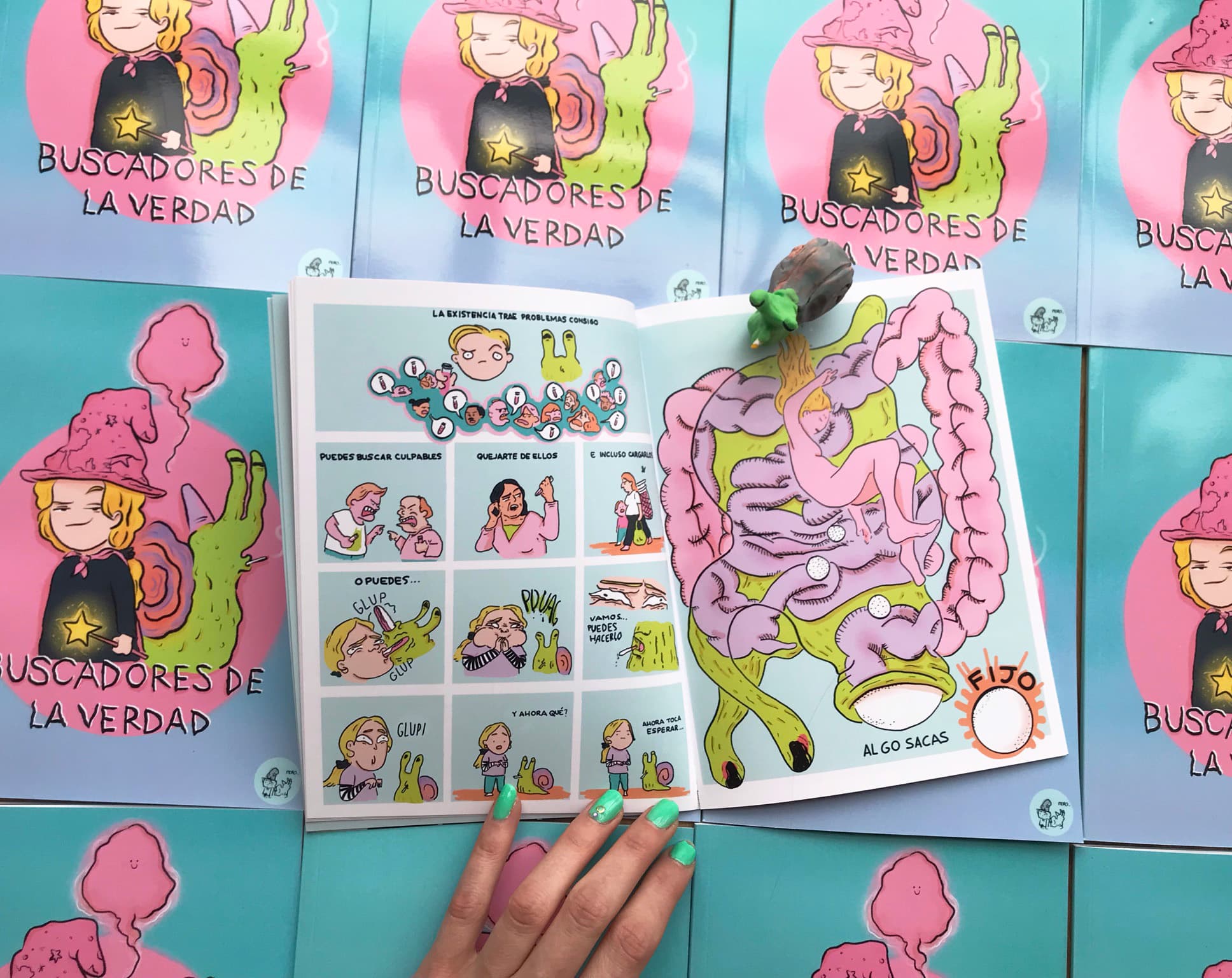 Buscadores de la verdad Cómic. 2021 Mi primera incursión al mundo del cómic, un “neurocómic” que explora preguntas existenciales a través del humor y las metáforas visuales.Un cómic bien loco protagonizada por una niña un poco desquiciada y un caracol fuma pitis.Cómic. Impresión digital. 2021